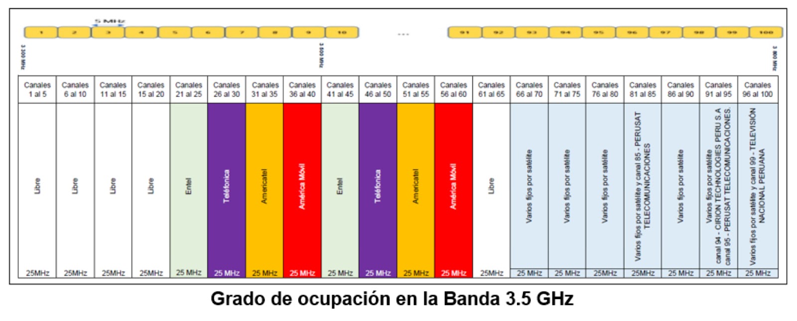 Además de Movistar,Claro,Entel y Americatel tienen asignaciones en la banda de 3.5 GHz,por lo que es necesario que las empresas interesadas en avanzar en el despliegue de 5G se sometan a un acondicionamiento voluntario para que puedan ubicarse en bloques continuos,en lugar de las ubicaciones discontinuas que existen por el momento.